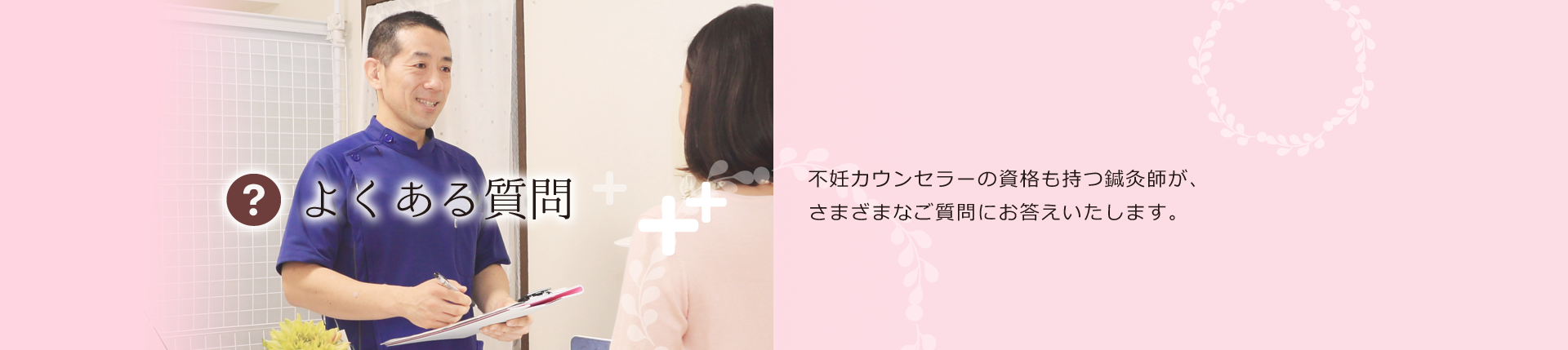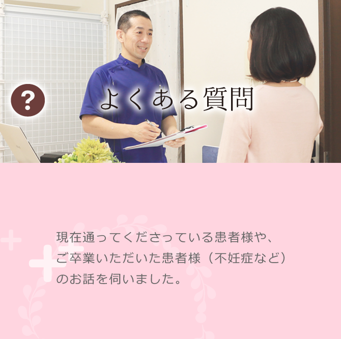 当院は男性鍼灸師がおりますので、チェックすべき症状や、男性不妊専門医の紹介など、なんでもご相談ください。